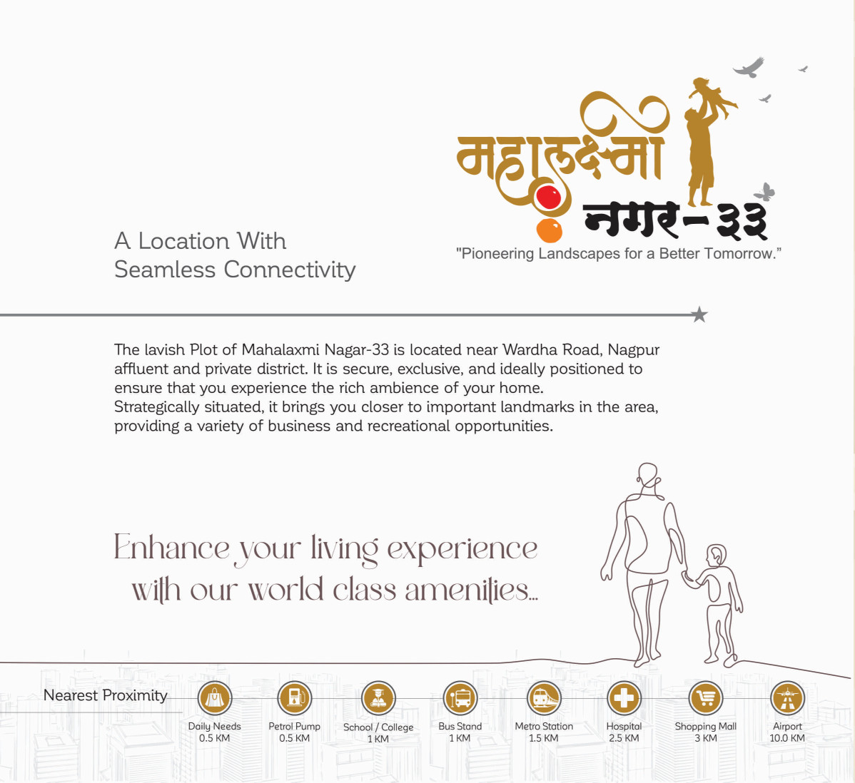 The lavish Plot of Mahalaxmi Nagar 33 is located near Wardha Road, Nagpur affluent and private district. It is secure exclusive, and ideally positioned to ensure that you experience the rich ambiance of your home. Strategically situated it brings you closer to important landmarks in the area, providing a variety of business and recreational opportunities. Relaxing and quiet surrounding where you can hear your own emotions of relaxation and achievement. A perfect place to enjoy life. Beautiful Topography surroundings with connectivity and comfort.